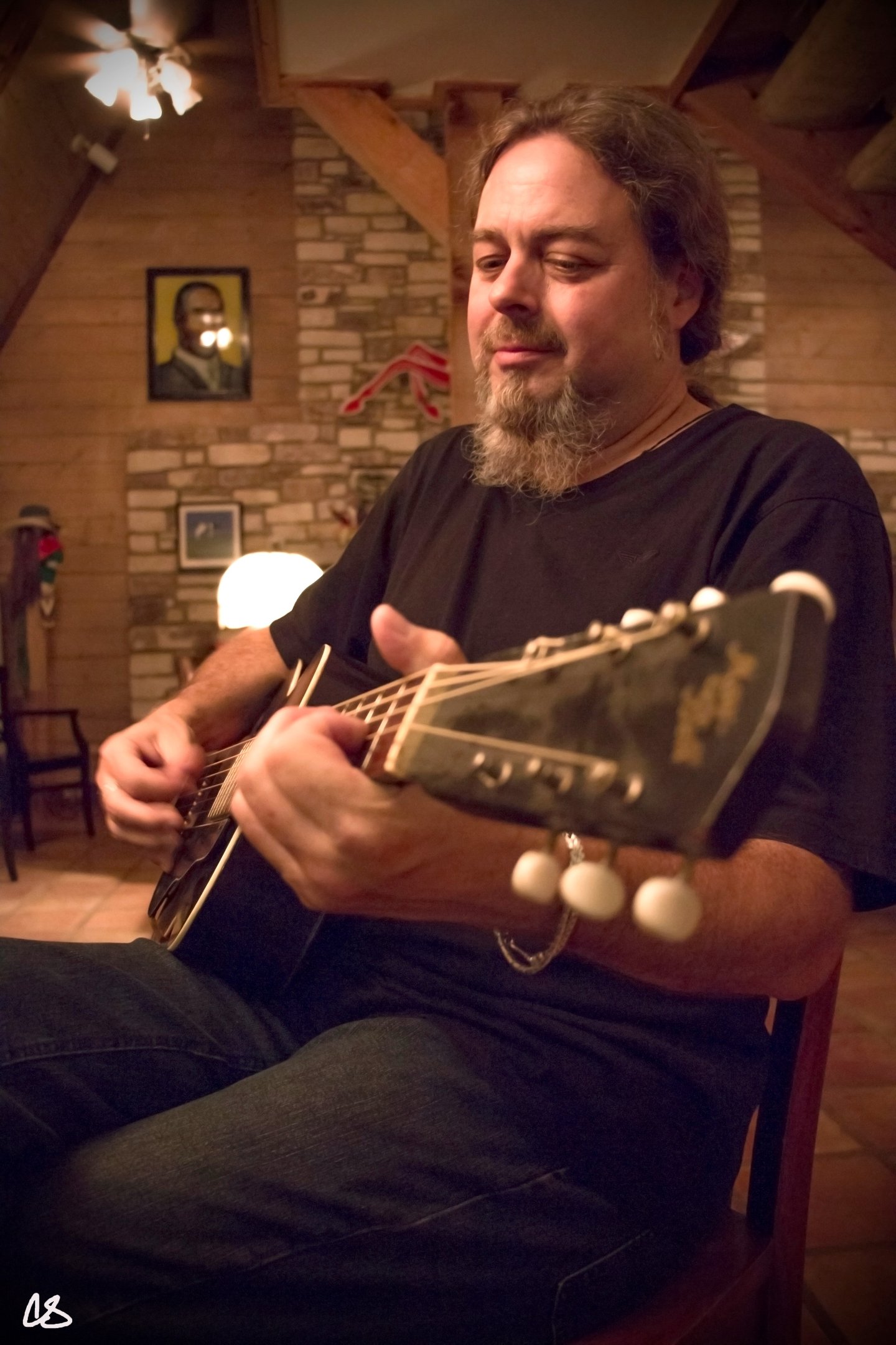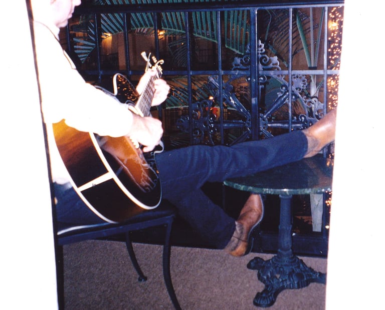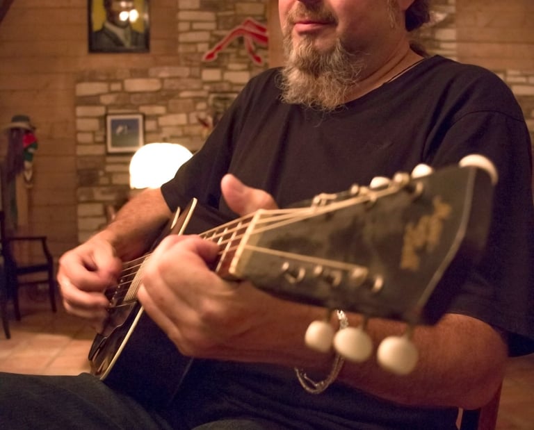 2016. Wimberly TX. Playing Kevin Welch's 1930's archtop. Photo by Holly O'Hare.