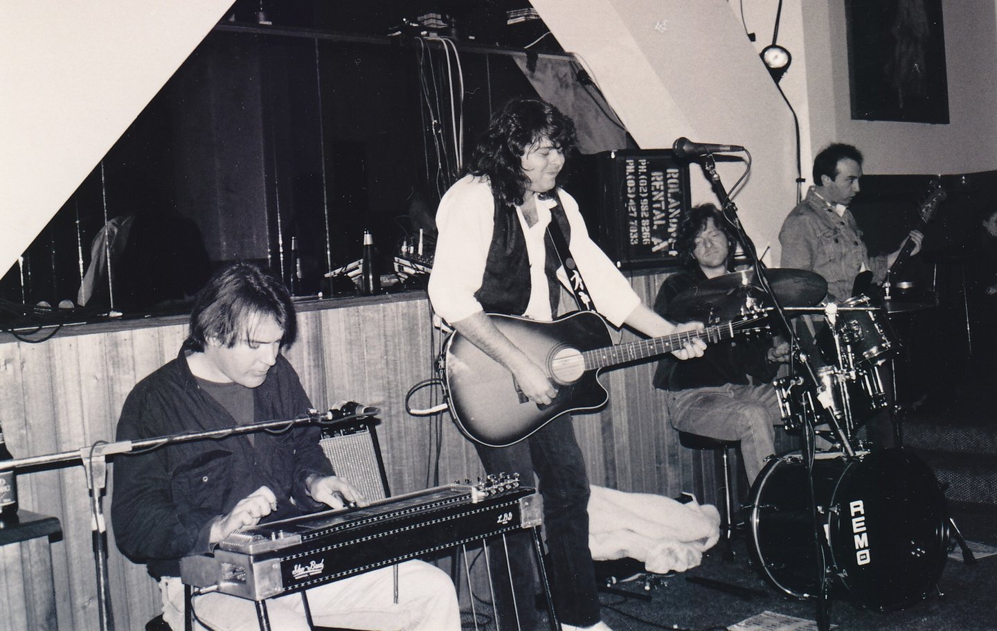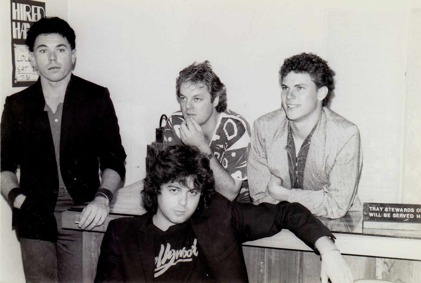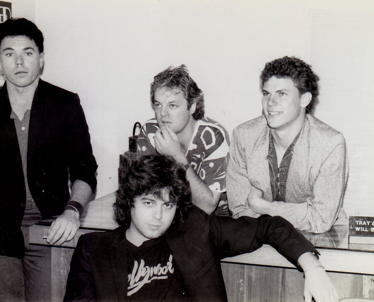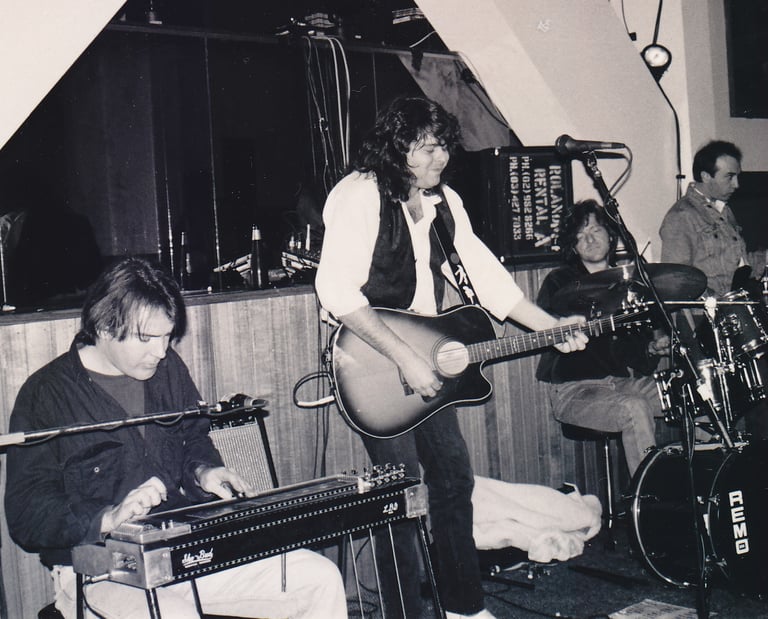 1986. Tweed Heads NSW Australia. With the band Good Home Cooking. L-R: Johnny Tebbut, CC, Neville Jess, Scott Whatman.