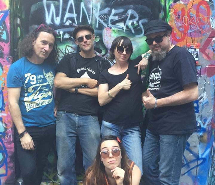 1989. Darwin NT Australia. The Lucy DeSoto Band. L-R: CC, Mick Aarts, the late Chris Turner, Lucy DeSoto, the late Peter Wells, and tour MC Louie the Lip at the bottom.