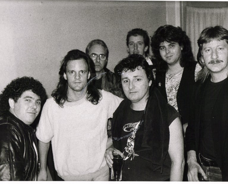 1989. Sydney NSW Australia. Backstage somewhere with the Big Rock Band. L-R: the late Peter Kekel (Jimmy Barnes), Mark Evans (AC/DC), Irish John Arthurs (Ward 13), the late Chris Turner (Rose Tattoo), Peter White, CC, Teddy Pepper (The Saints).