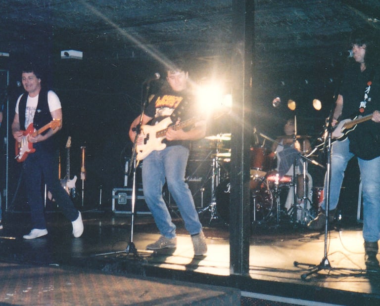 1992. Joey's St. Kilda, Melbourne VIC Australia. Yet another incarnation of the Cletis Carr Band. L-R: Garrett Costigan, CC, Paul Keane, the late Robbie Geappen.