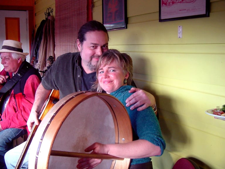 2012. Katoomba NSW Australia. House jam at my place, with one the Blue Mountains' best music promoters, Meg Benson. And that's San Antonio folk legend Jack Pledge, behind us.