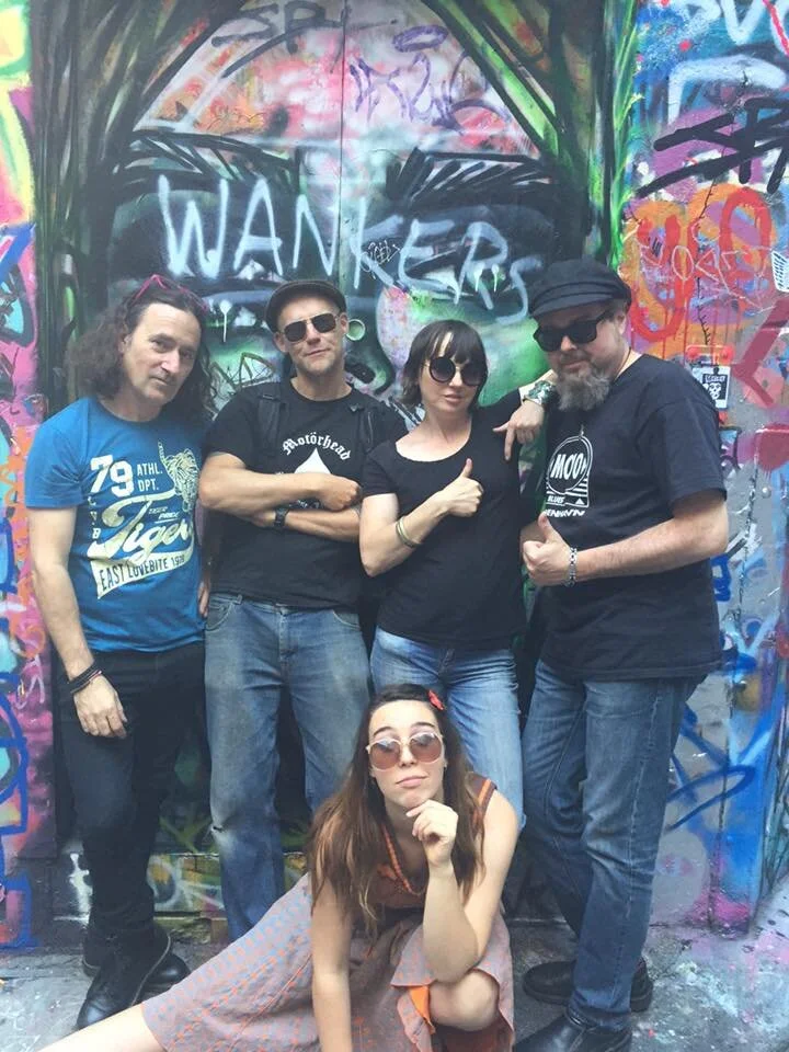 1989. Darwin NT Australia. The Lucy DeSoto Band. L-R: CC, Mick Aarts, the late Chris Turner, Lucy DeSoto, the late Peter Wells, and tour MC Louie the Lip at the bottom.